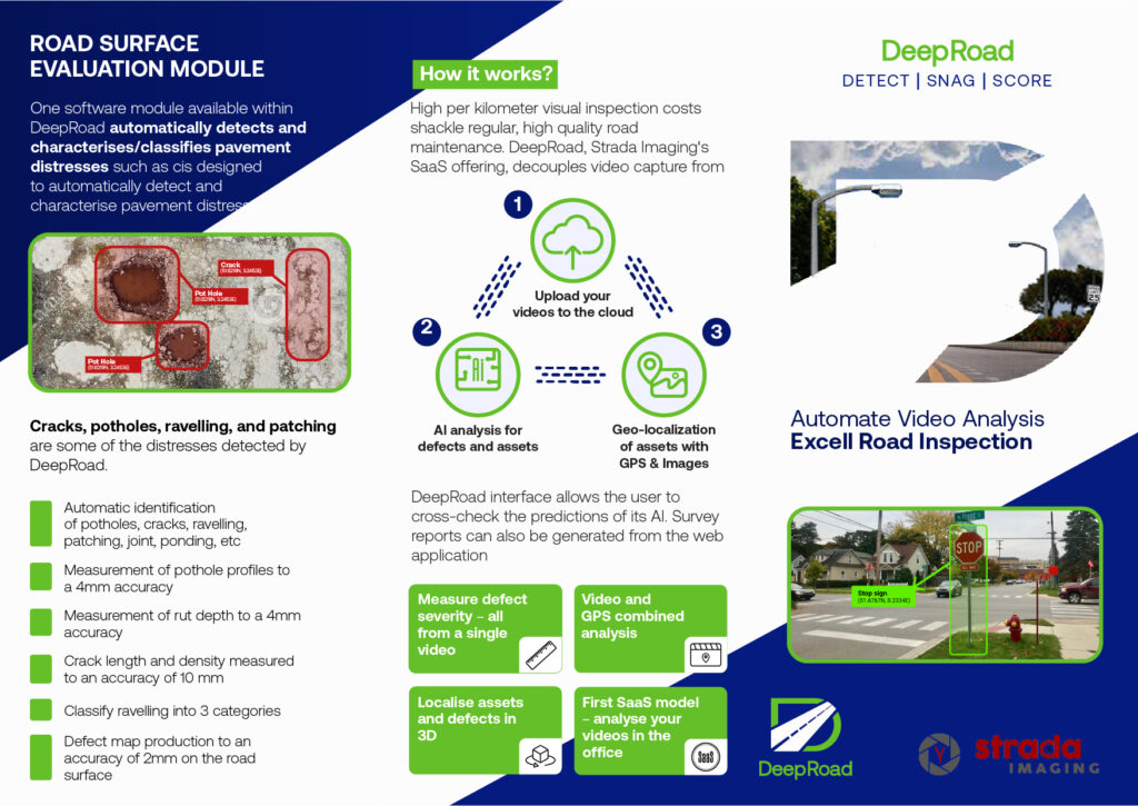 The biggest challenge that Strada Imaging tackled in developing DeepRoad is training a robust AI that can analyse videos obtained from different camera systems. The solution is the result of years of multi-disciplinary R&D, within Strada Imaging and its academic collaborators, spanning 3D imaging, AI, and software engineering.